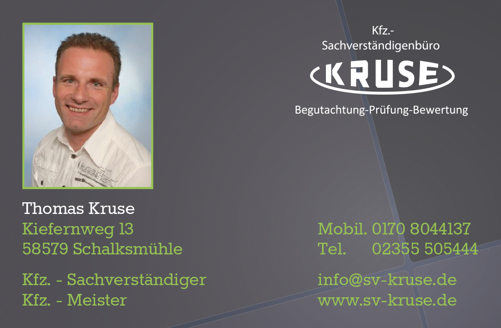 Ich gebe Hr. Kruse sehr gerne für seine Arbeit 5 Sterne! Wir hatten in den Niederlanden auf der Autobahn einen unverschuldeten Unfall... Hr. Kruse hatte nicht nur schnell und kompetent das Gutachten erstellt, er ist sogar ständig bereit gewesen uns mit seiner freundlichen und hilfsbereiten Art bei Fragen zu der schwierigen Situation mit der Schadensregulierung die durch die Niederländische Versicherung entstanden war zur Seite zu stehen! Vielen Dank dafür ;-) ! Ich werde ihn immer weiter empfehlen !!!